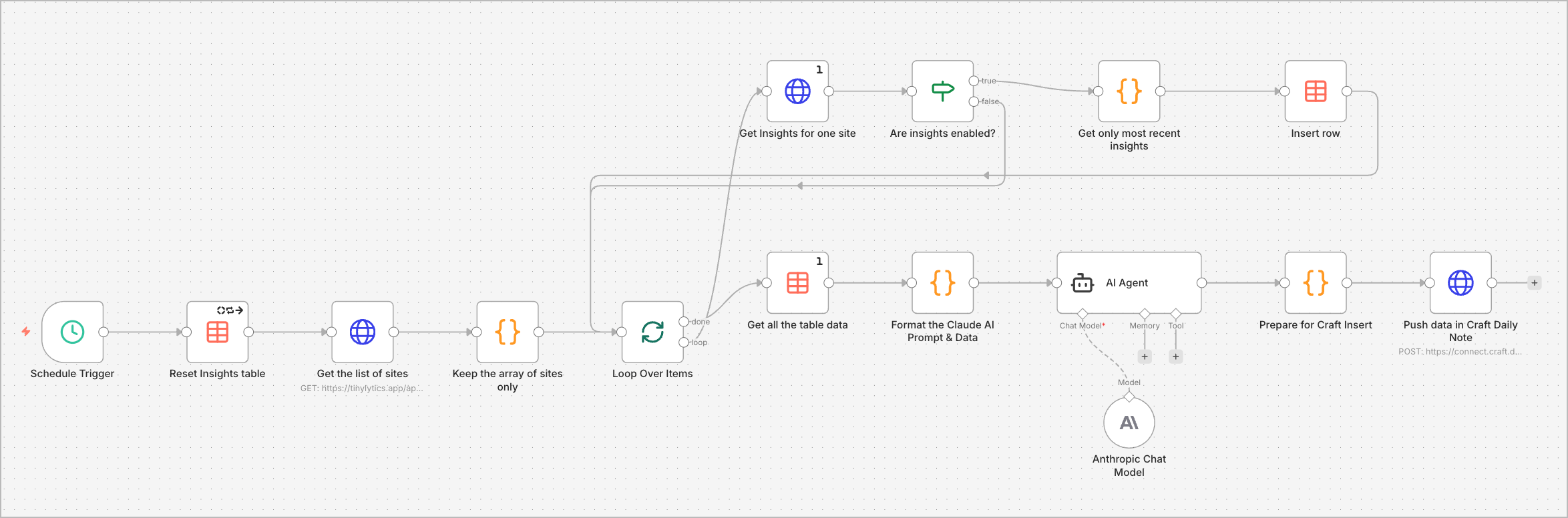 My most “complex” n8n workflow so far. This workflow retrieves Tinylytics AI-generated insights for the day across all my websites and creates a meta-summarization for inclusion in today’s Craft Daily Note.