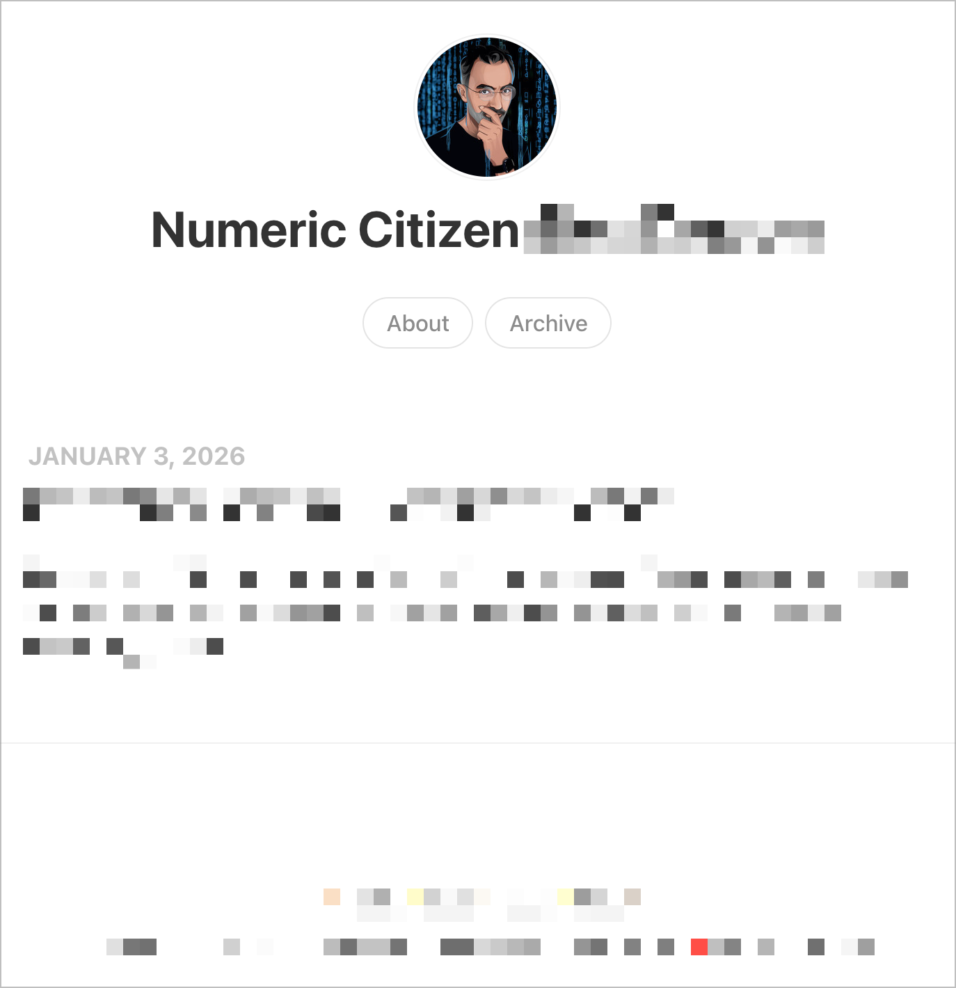 January 3, 2026 9:22am January 3, 2026 9:22am Numeric Citizen Misc Newsletter Putting up a new website on Micro.blog is way too… easy. 🫣🤫🫢 Give Kudos ✴️ Also on Micro.blog ✍️ Reply by email 🦣 Reply with Mastodon