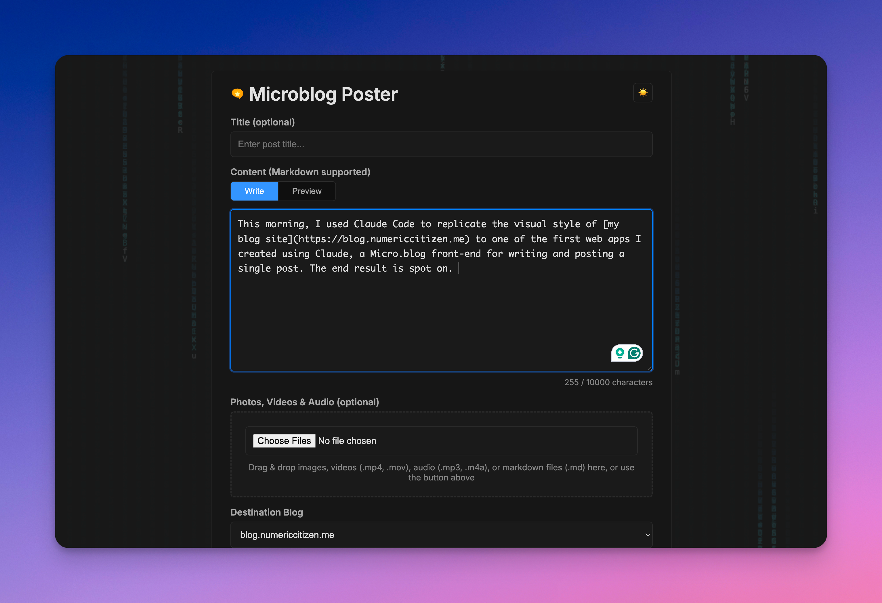 This morning, I used Claude Code to replicate the visual style of my blog site to one of the first web apps I created using Claude, a Micro.blog front-end for writing and posting a single post. The end result is spot on.