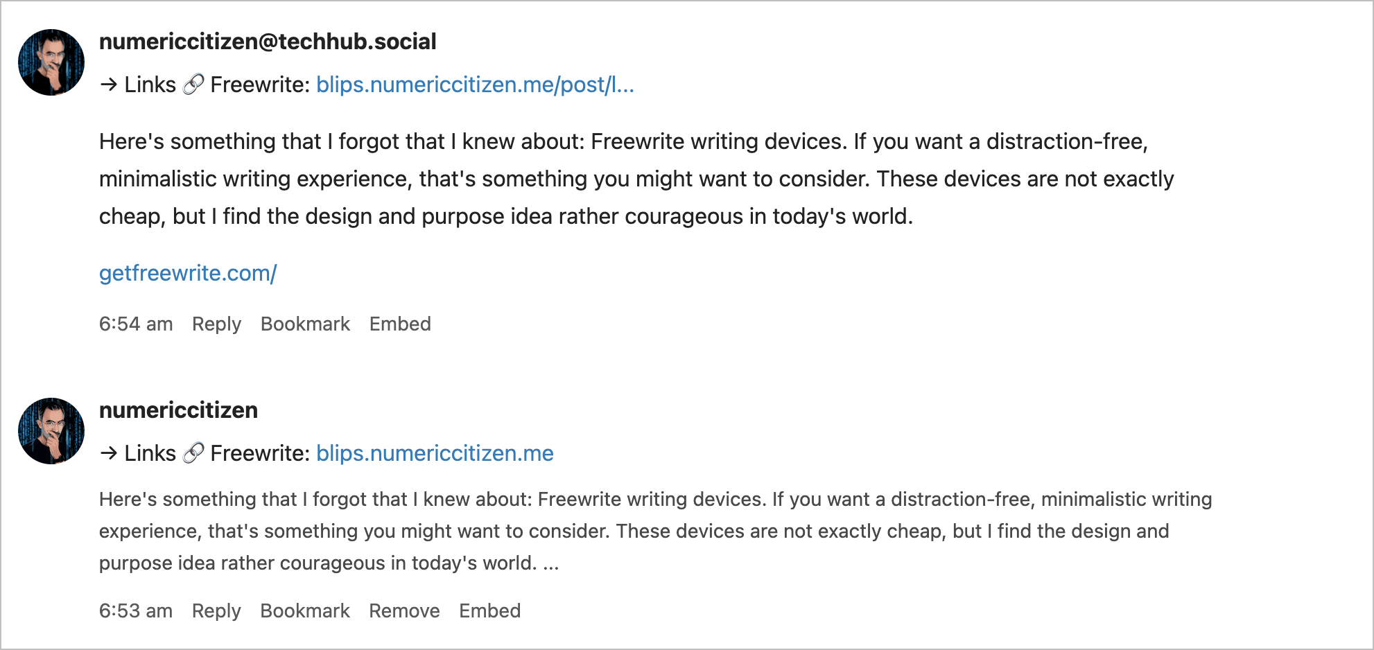 When blogging from Scribbles.page, this is how the blog post will appear on my timeline (because I use Micro.blog’s RSS feed reading capabilities, which is really cool). The first occurence of the post is the cross-posting result from Micro.blog to my Mastodon account (yes, I subscribe to my own Mastodon account). I see the full post including the shared link. The second occurence is the RSS feed article as grabbed by Micro.blog and reposted on my timeline; if you follow me on Micro.blog, this is what you will see. The post is truncated and the link is missing. I think there is room for improvement here. cc @manton